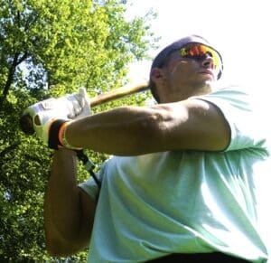 肘がヘソ方向へ入る瞬間に、グリップも同時に前へ動きます。一方で、肘が高く上がりすぎると、肘が下がるまでグリップは動けず、振り遅れの原因になります。